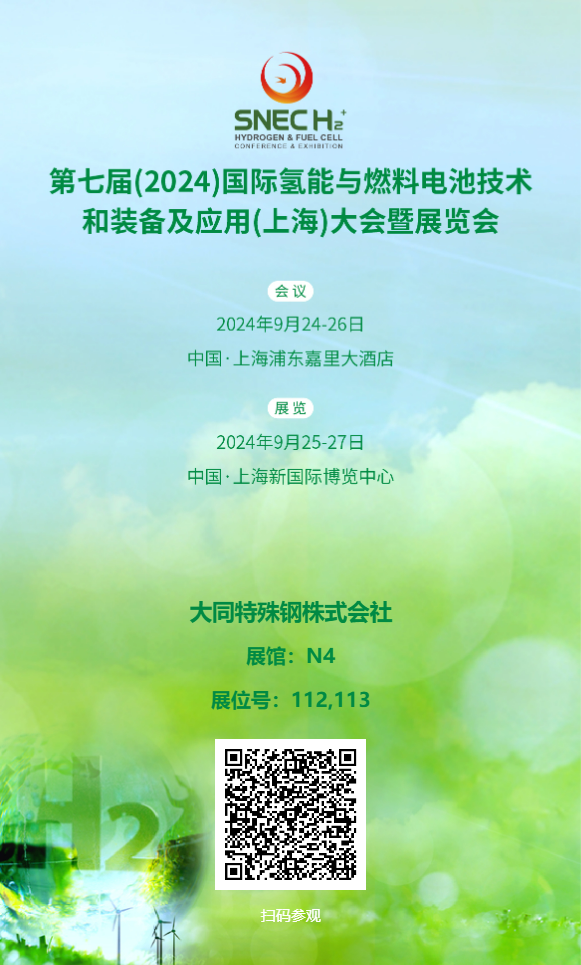 SNEC-H2第七屆(2024)國(guó)際氫能與燃料電池技術(shù)和裝備及應(yīng)用(上海)大會(huì)暨展覽會(huì),將于2024年9月25日至27日在上海新國(guó)際博覽中心(上海?浦東)舉行。大同特殊鋼(上海)有限公司作為大同特殊鋼的代表,將出展此次展覽會(huì)。