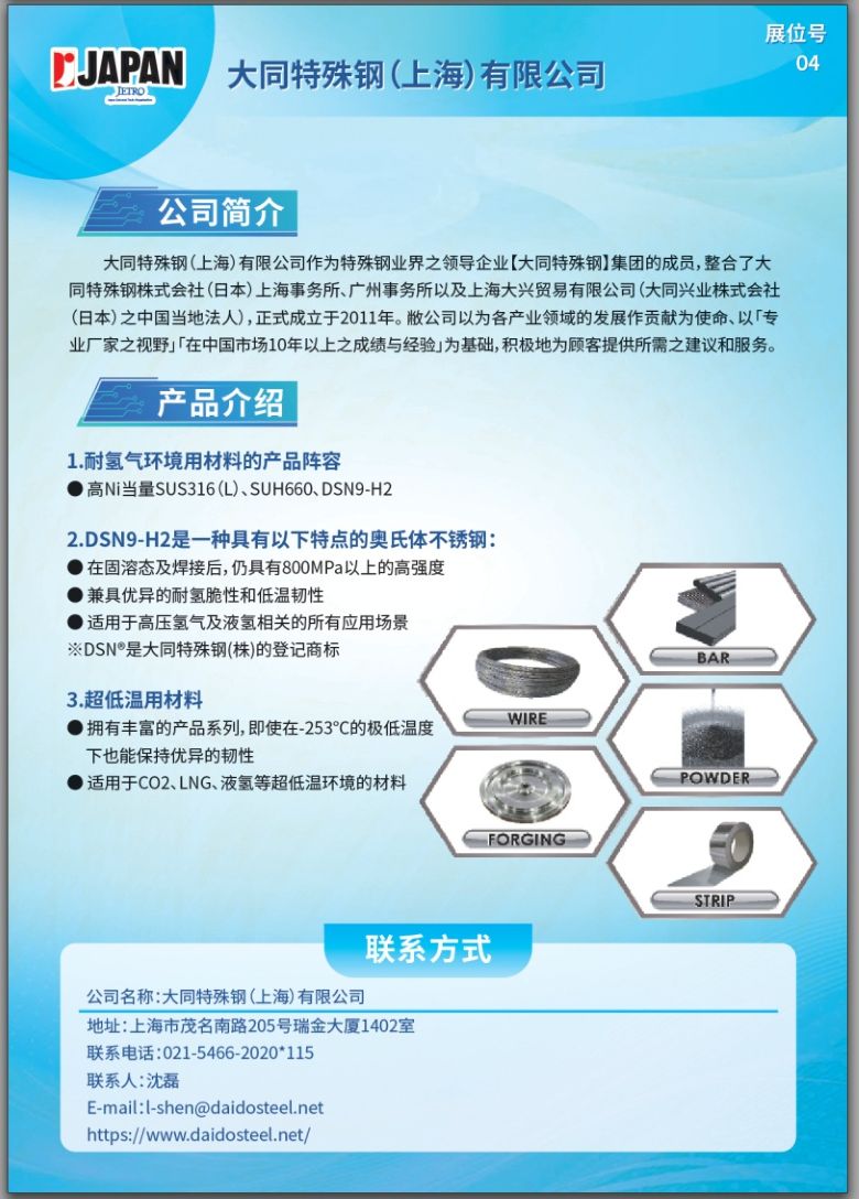 大同特殊鋼展位:燃料電池2號館C07-32,C07-20展位,歡迎氫能行業(yè)各位人士蒞臨參觀交流。